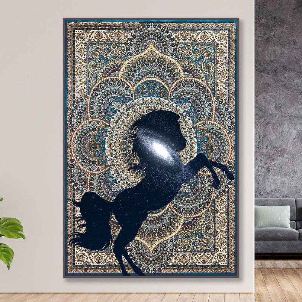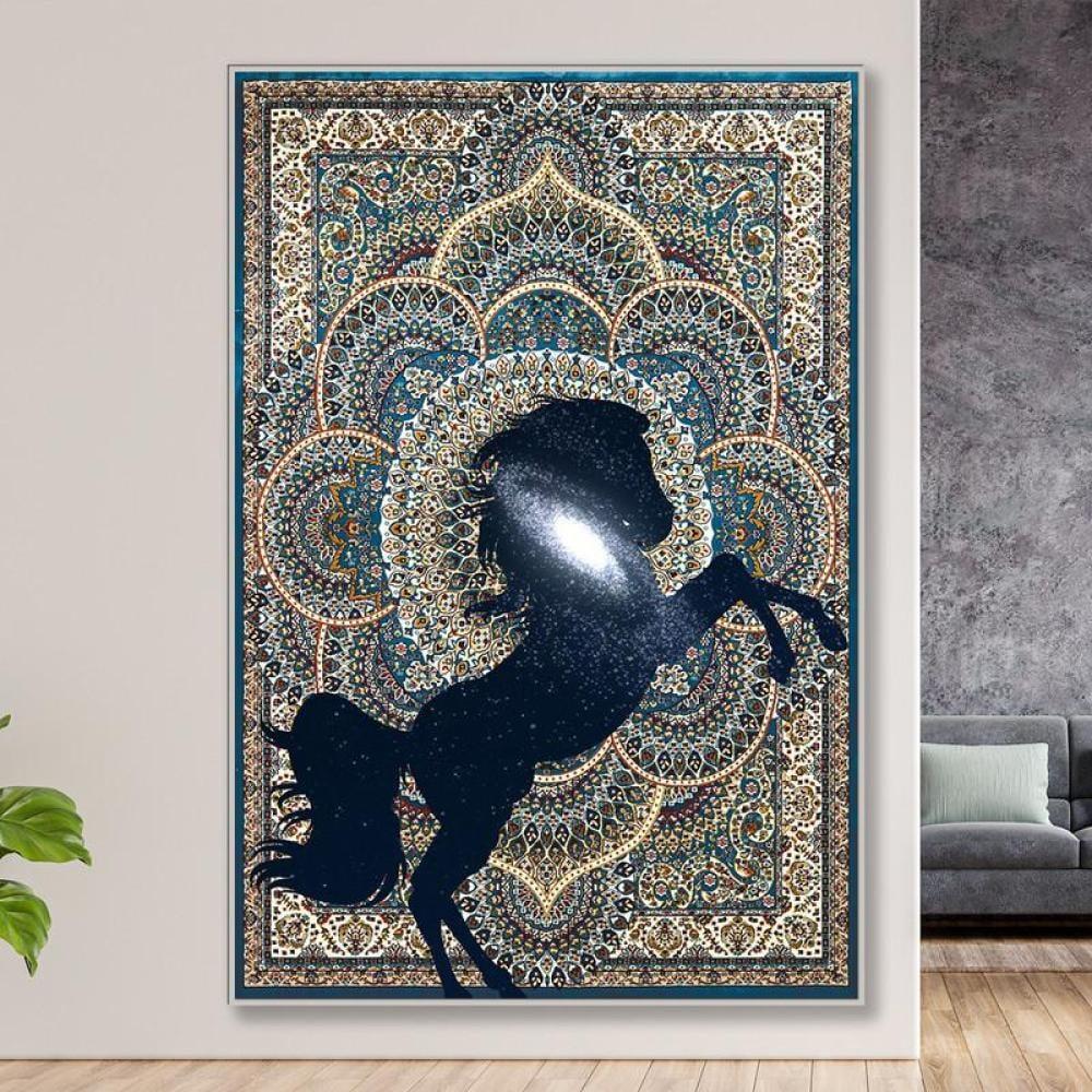 لوحة قماشية فنية بتصميم إسلامي مزخرف يظهر حصانًا راقصًا في وسط الزخارف المدهشة، مما يضفي جمالًا فنيًا وشرقيًا على مساحاتك. اطلبها الآن!